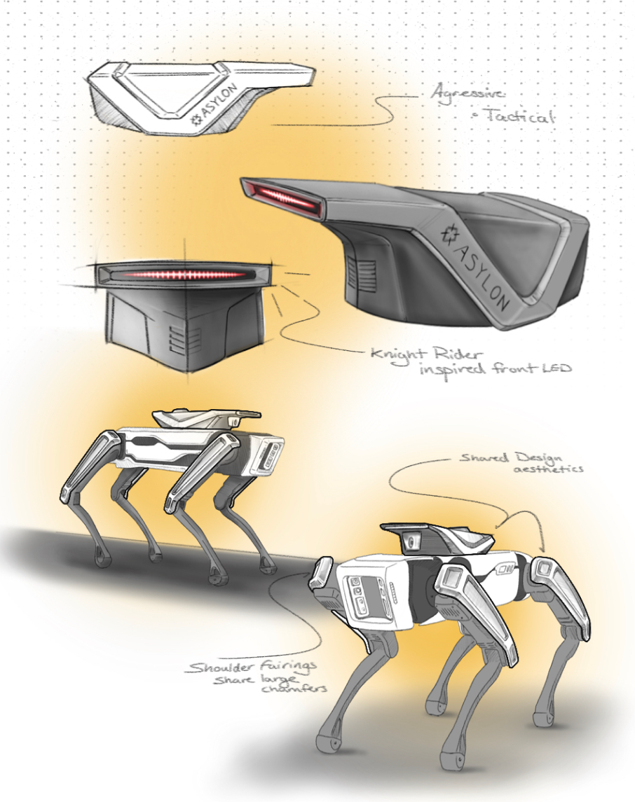 Our primary objective when optimizing Asylon's design language was infusing it with a more rugged aesthetic that effectively conveyed the security nature of their services. This involved enhancing cohesion among their 3D printed “Pup Pack” and shoulder fenders while emphasizing a visually appealing and robust appearance.